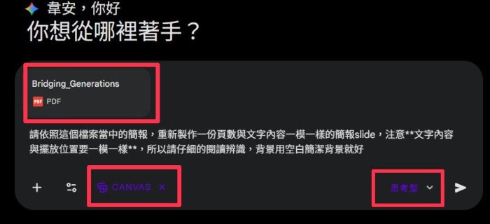 2. 將PDF檔上傳到Gemini,打開Canves工具,請他製作一份頁數與文字內容完全一樣的slide