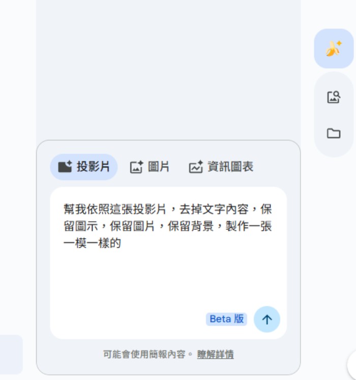6.用另存成的google簡報檔案,打開右側的nano banana,每一頁都下指令